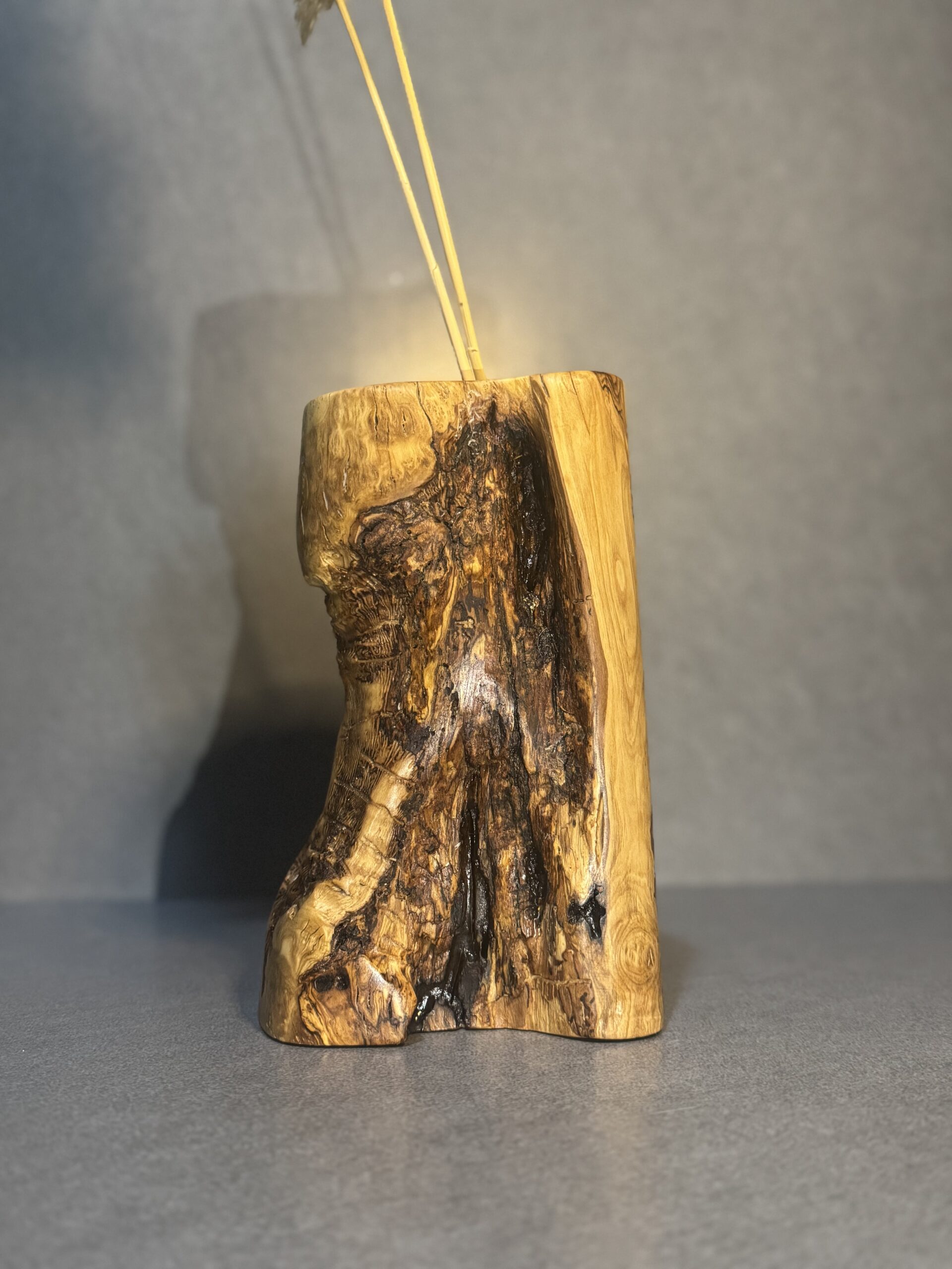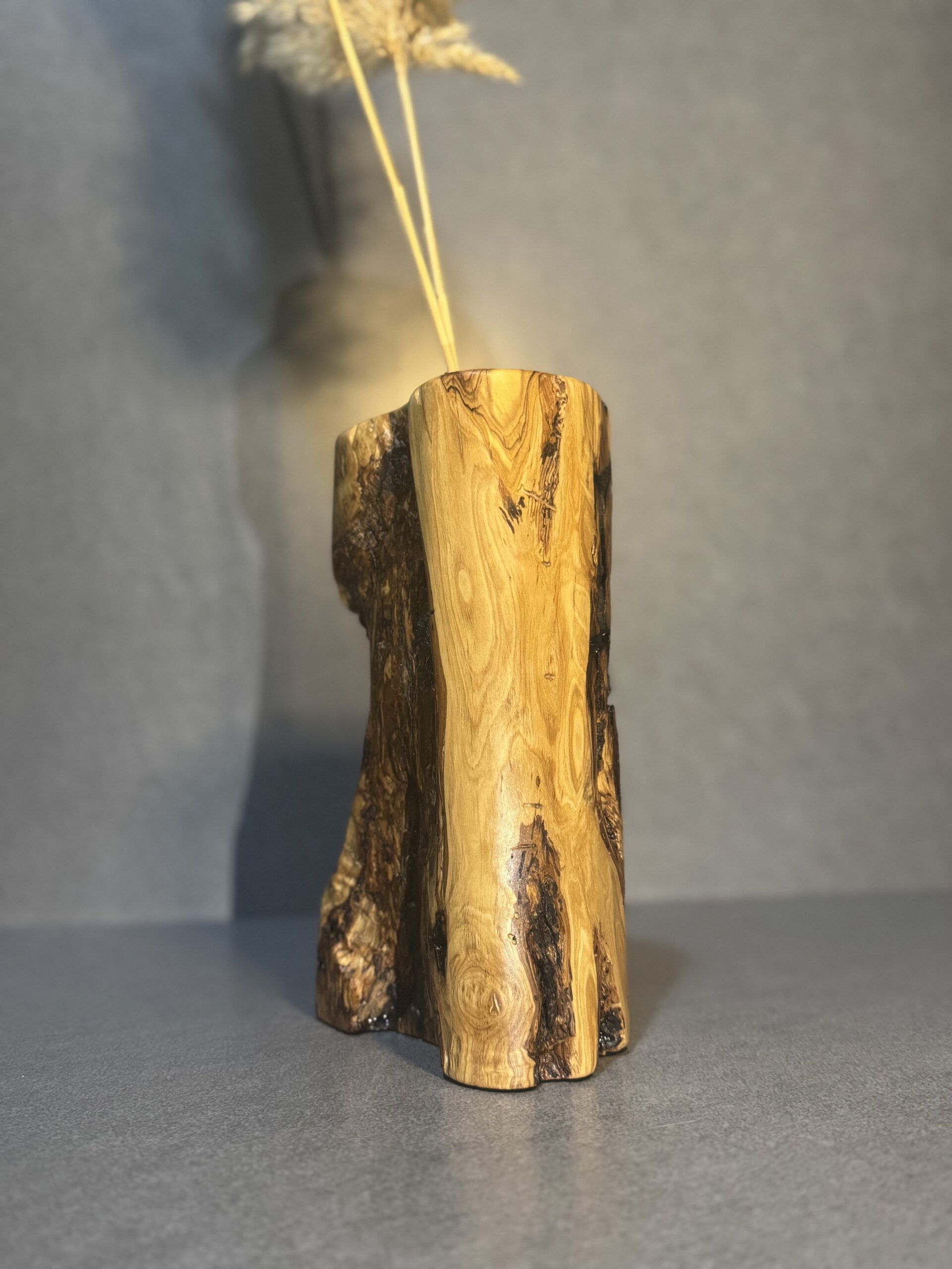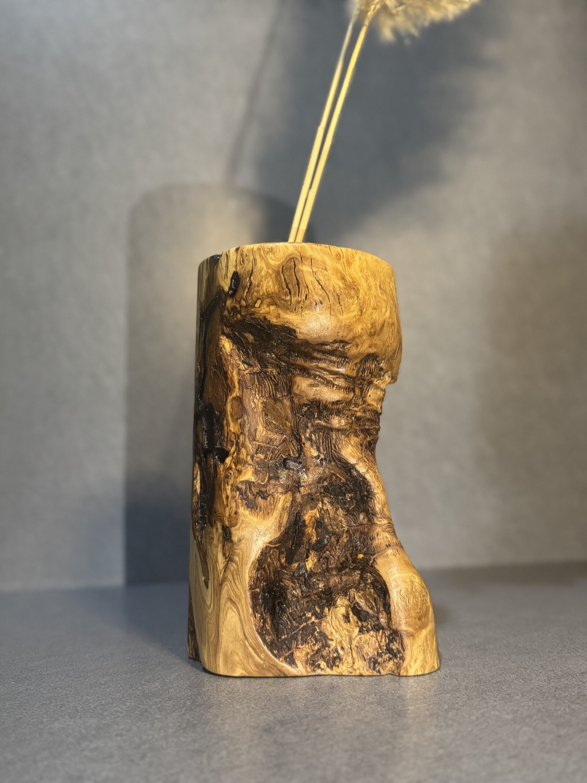 This handmade vase from olive wood is a refined statement piece crafted for those who appreciate natural elegance and artisanal quality. Carved from authentic, sustainably sourced olive wood, it showcases rich textures and intricate grain lines that transform every piece into a sculptural work of art. Its warm tones and polished finish bring depth and character to any room, making it ideal for dried floral arrangements or as a standalone decorative object. Designed with premium craftsmanship and timeless aesthetic appeal, this olive wood vase elevates modern, rustic, and minimalist interiors alike. Perfect for customers searching for handmade wooden décor, olive wood home accents, or unique natural vases, it blends beauty, functionality, and originality in a way only true handcrafted artistry can achieve.